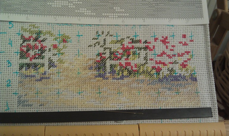Всем привет! Я опять вернулась к "Виду на залив", вот такая я непостоянная:) Подушку с волками решила оставить на отпуск (я все еще на него надеюсь!), ее удобно брать в дорогу, поскольку не нужна ни схема, ни рамка.
