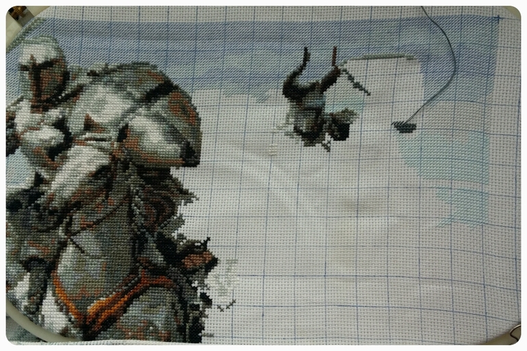 Привет всем! Чего-то лень на меня "напала"))) Вышивала мало-мало, полукрестиком небо и голову рыцарю.
