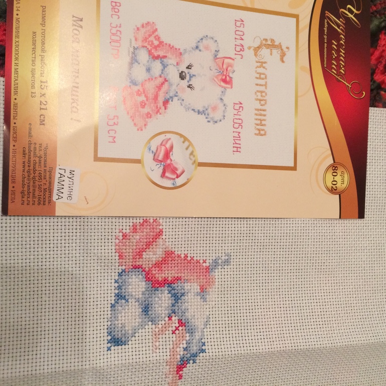 Всем привет! Очень приятно видеть свою работу в начале поста. Спасибо девочкам за оценку моего труда. Ну а теперь о результатах за эту неделю. В этот раз я завершила буквально ха два дня Нюшу от Алисы и начала вышивать мишку детская метрика "Моя малышка" от чудесной иглы. Ой, фотка перевернулась, доберусь до компа изменю, ну а пока итак виден мой результат. Работы полно, сколько ещё наборов в норке моего хомяка ждут своего часа. Девочки, а сколько этапов в ВД?