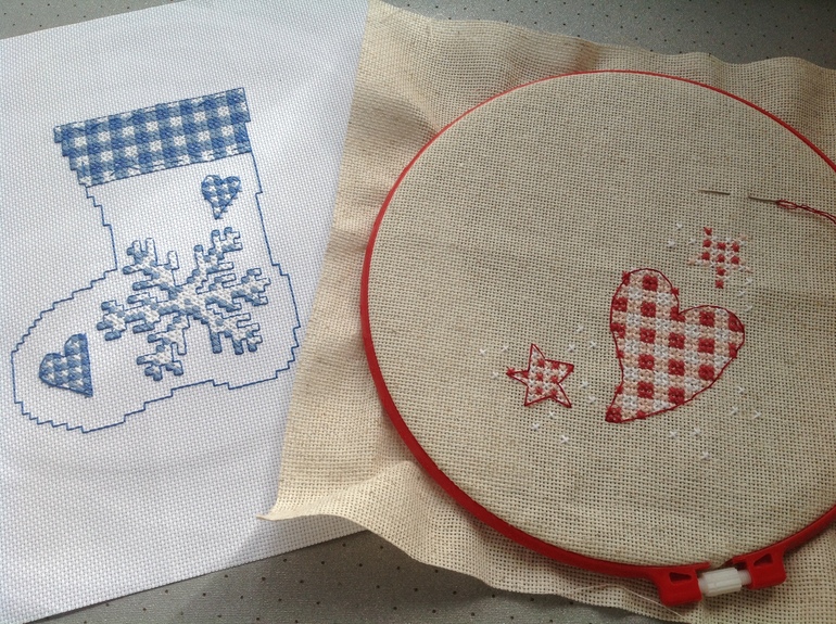 Привет, девочки! Сегодня я со вторым сапожком для дочи. Долго думала над канвой, в результате выбрала льняную, на ней можно и отдельные белые снежинки вышить, а на белой не видно было бы. Рядом сапожок сына из прошлого отчёта. Вышила совсем мало, сейчас стараюсь метрику закончить в соседнем совместнике.