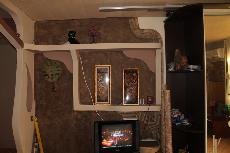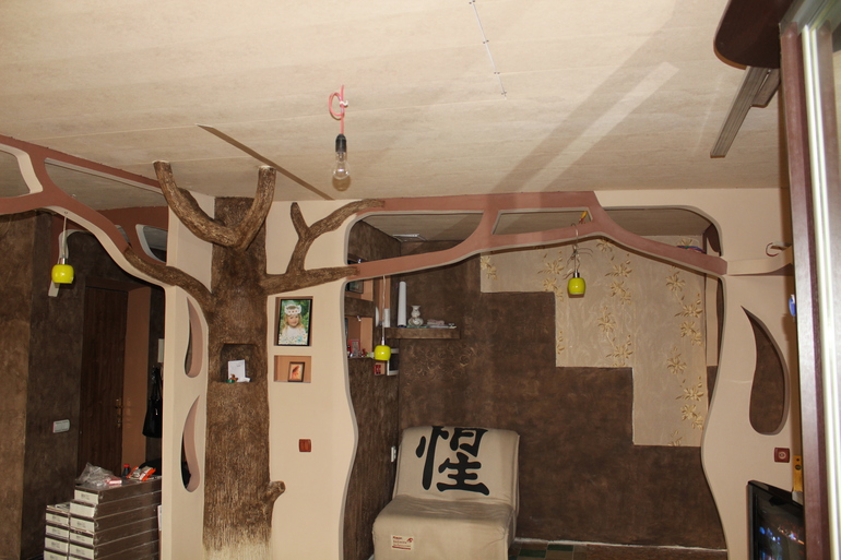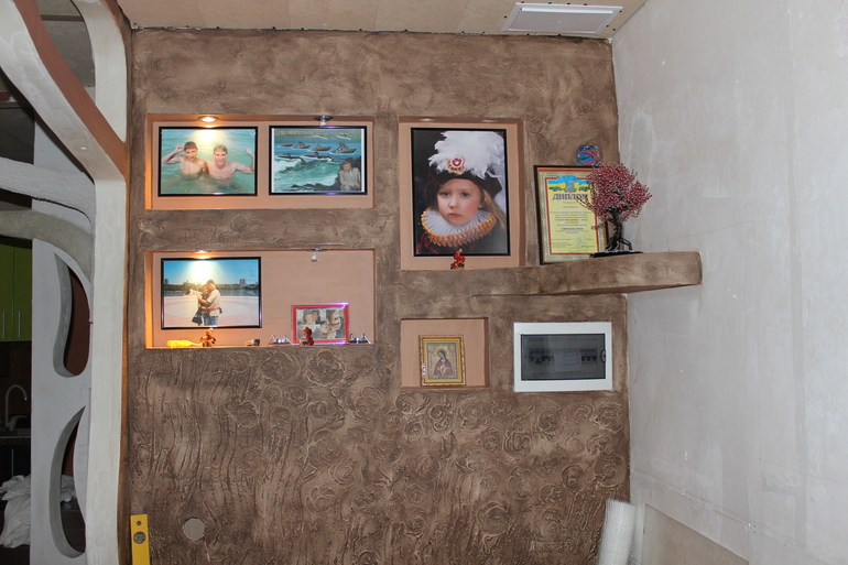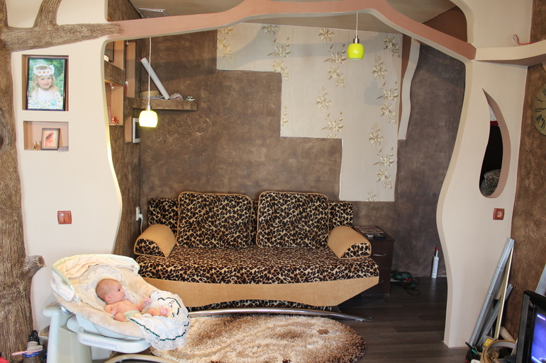 Последнее все уже делали я с Тимкой в пузе была))) все стены штукатурку декоративную делала сама и красила все) Кухню я придумала, с папой рассчитали и собирали сами, дерево и все остальное делал муж сам)