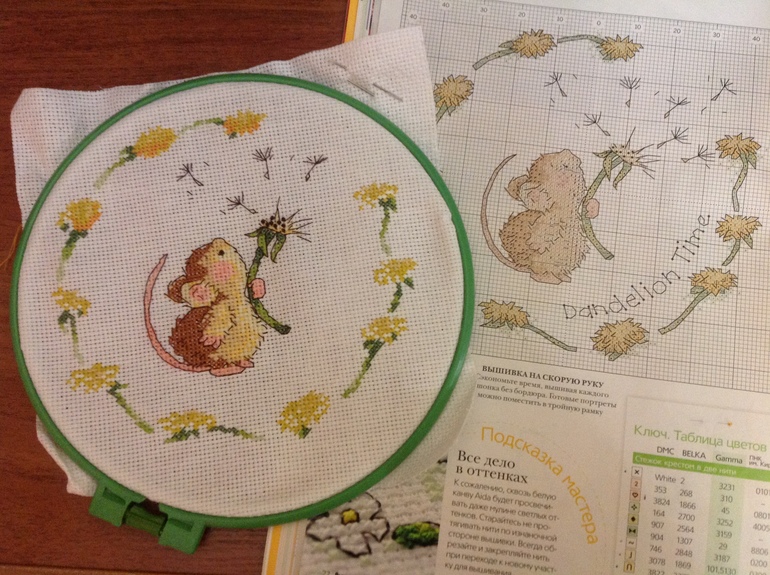 Девочки, я сегодня с новым детским проектом, метрику закончила, показывала в прошлом отчете, а сегодня я с вышивкой для оформления коробки. Хочу сделать три похожие вышивки для коробочек с малышовыми принадлежностями. Это будут классные мышата, сегодня первый. Ещё не закончен бордюр из одуванчиков, мышонок закончен.