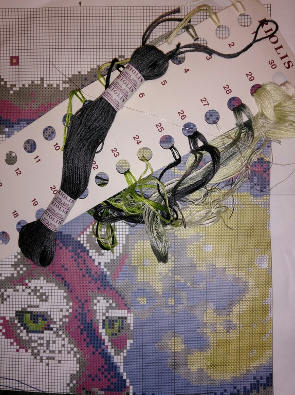 Остатки от набора Полнолуние от Риолис. Ниток много осталось, кроме металлика. Мне его не хватило, докупала ДМС Е168.