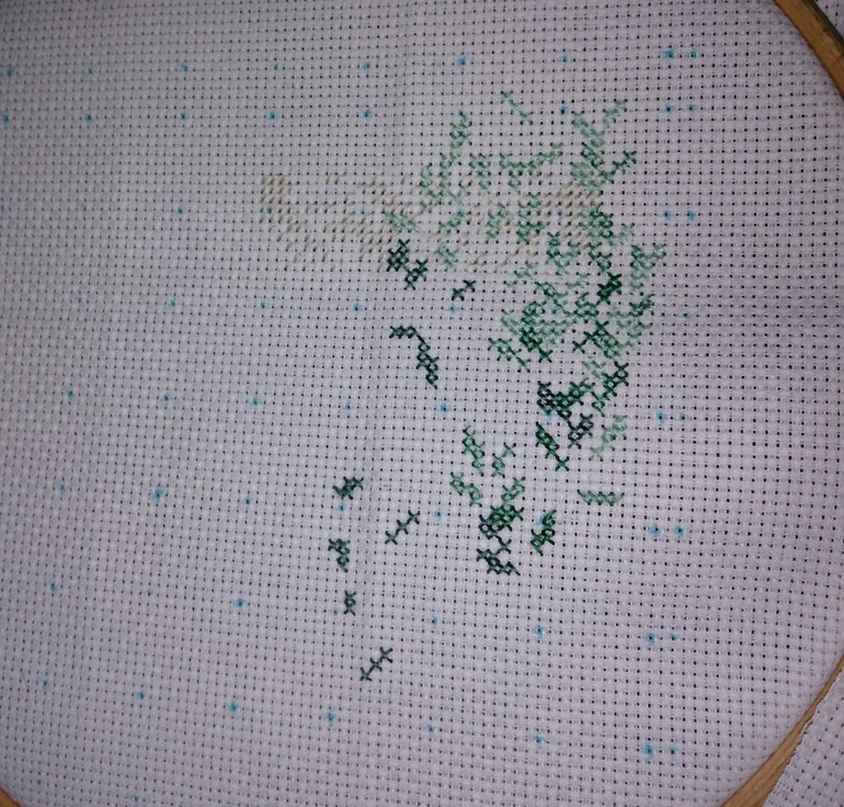 Я не утерпела и его уже немного начала)) Шить буду на аиде 16, хотя равномерка подошла бы гораздо лучше. Ну и вот что у меня уже есть: