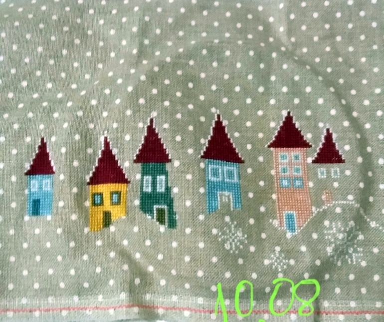 Привет всем! Моя вышивка не спеша движется. Домики строятся, елки растут, первый олень уже полетел. Вот когда ласточки низко летают, это к дождю. А олени, летящие над городом, это к чему? К снегу?