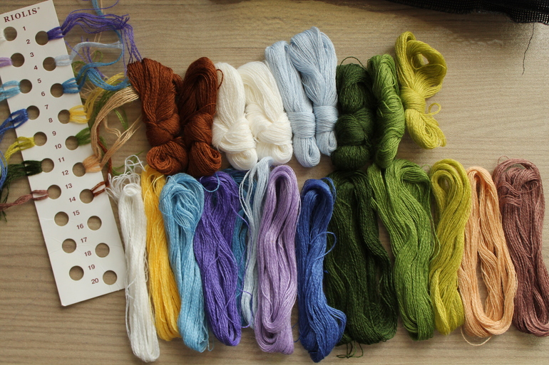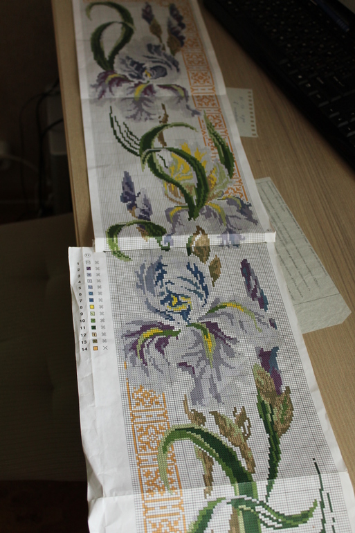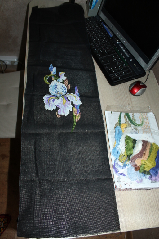 Начала я его вышивать и хватило меня на один центральный цветок. Работа очень большая, да и шерстяными нитками мне не очень понравилось вышивать. Хотела бы его продать. Может кто хочет до вышивать ирисы, может кому канва и нитки нужны (ниток много).
