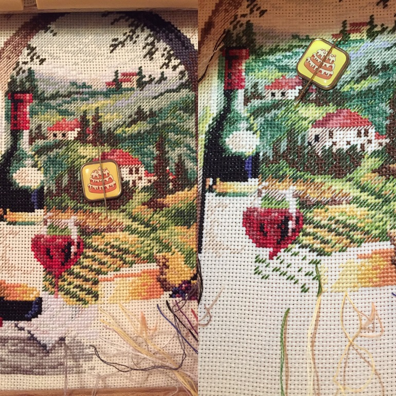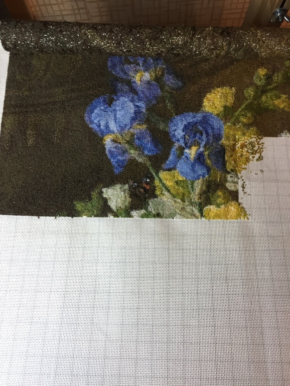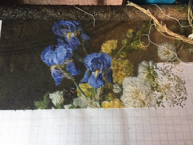 Захожу в последний вагон) Фактически закончена 1/3 вышивки без одного соцветия. Но дожать уже сегодня не хватило сил. И так под уроки с сыном вышивала))