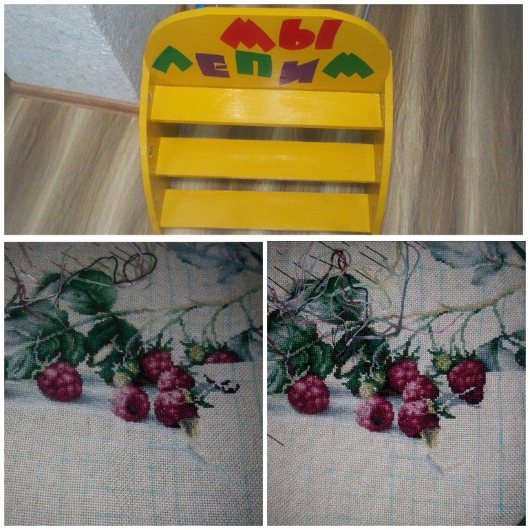 Всем привет! Неделя у меня выдалась очень сложной. Я сильно заболела. Три дня ко мне приезжали врачи ,следили за моим состоянием, так что вышивала я всего один час((( сейчас постельный режим,прихожу в себя. Но так же я успела доделать стенд для лепки в садик и " посадить" старшую дочь на иглу ,первые крестики она сделала)))