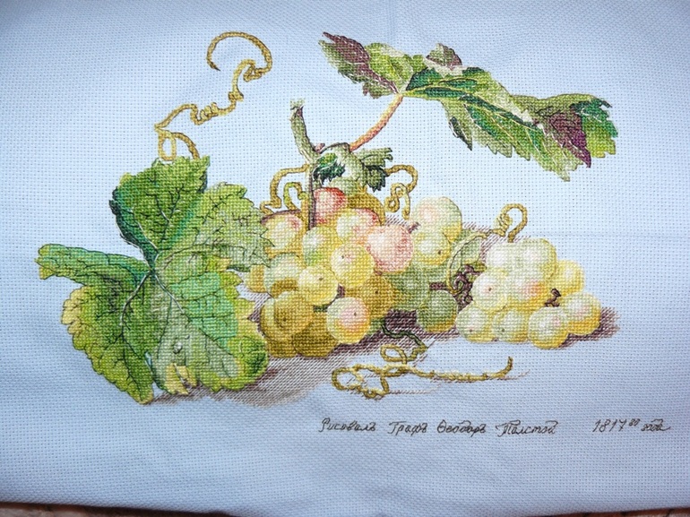 И мой виноград. Завтра при свете дня буду проверять весь ли бэк я вышила, потому что его тут столько... СТОЛЬКО!!!! Разноцветного по 2-3 стежка. Что за этим бэком уже крестиков не видно, и особенно не видно полукрестиков, на которые было потрачено столько времени. В общем вот. Неотглаженный, как говорится с пылу. Но, все потом. Вот он, мой красавец)