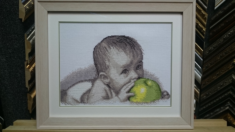 ну, и фото оформленного Малыша с яблоком от "Овен", который подарен моей лучшей подруге, а она мне сообщила, что вышивка в тему, т.к. она беременна