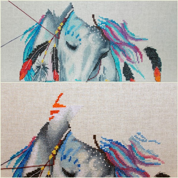 Это точно, движется быстрее в 1,5-2 раза! Но мне кажется и по цветам, даже если это будет 1 цвет и длинная нитка, я чисто физически успею в час 300 максимум. Эту шью парковкой, потому что полная зашивка, оттенки практически неотличимы на глаз, крестики ровнее, да и люблю я парковку ;)