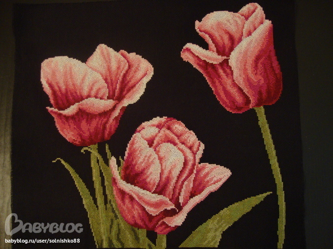 так мне нравится черная канва - на ней все смотрится совершенно по-другому) красивые тюльпаны!