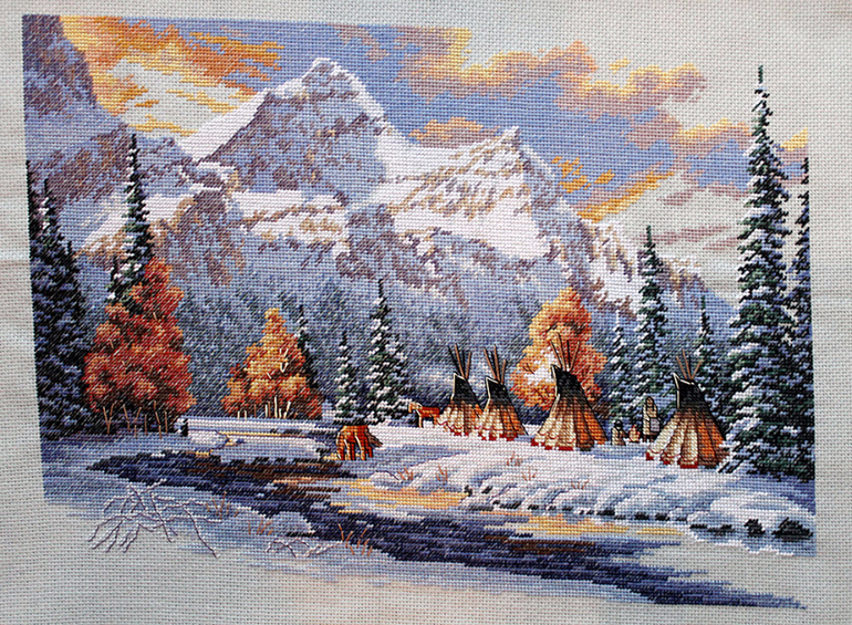 Вышивался набор ровно месяц в рамках осеннего конкурса. Без напрягов, потому что почти вся работа вышивается полукрестом, кроме лошадок, домиков индейцев и самих индейцев) Надо быть внимательным где вышивка в 2 нитки, а где - в 3. Я ошиблась и потом всю реку пришлось дошивать поверх 2 еще и третьей ниткой. Бэка очень мало - домики, люди и стволы деревьев. Ну и травка. Горы и небо вышивались особенно приятно - такие цвета чудесные, и такое чувство что и дышится легко как у подножья гор, как поздней осенью))