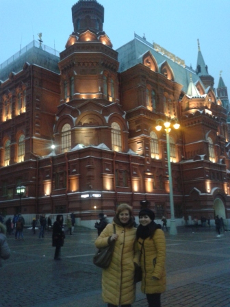 Но я почти закончила заказной альбом, сделала 4 новогодних шарика, один из которых в технике артишок. но пока шарики не покажу, их еще нудно "довести до ума". А еще на каникулах ездили с детьми в Москву на экскурсию. Были в палеонтологическом музее и небольшая обзорная. Для некоторых детей это был первый визит в Москву и они впервые увидели Красную площадь, Кремль, собор Василия Блаженного... ну а это я с моей коллегой-подружкой-"почти дочкой"
