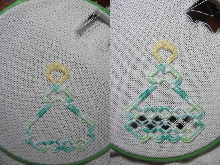 Достала прошлогоднего ангелочка в технике хардангер, начала, но удалось посидеть всего часик - пригласили в гости.