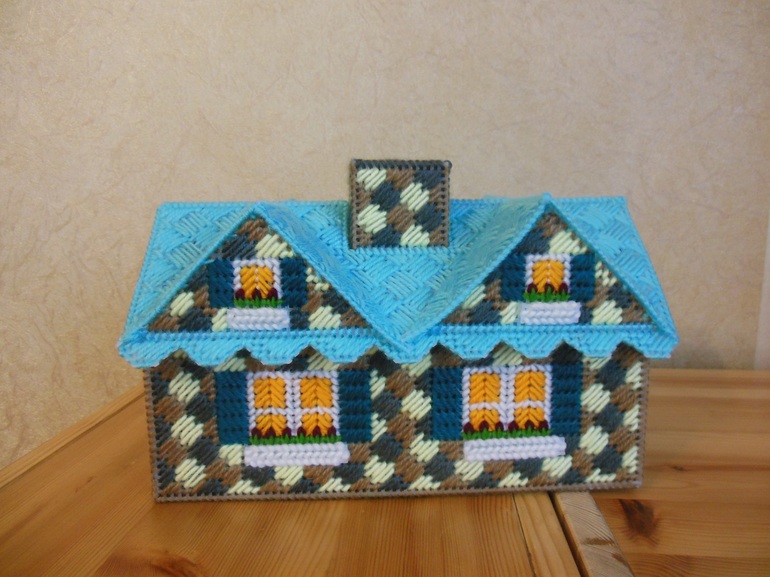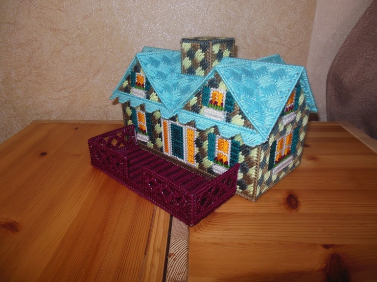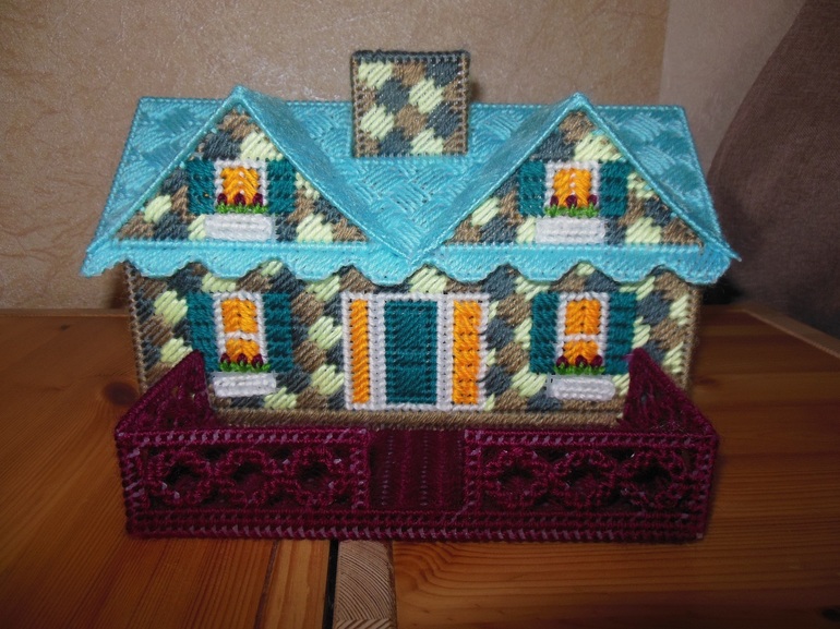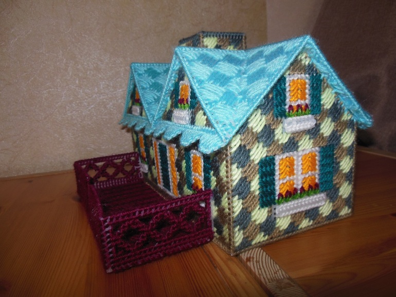 Спасибо! Там части домика из жесткой пластиковой канвы, каждую деталь обшиваешь, а потом все вместе собираешь.)) Не сложно))