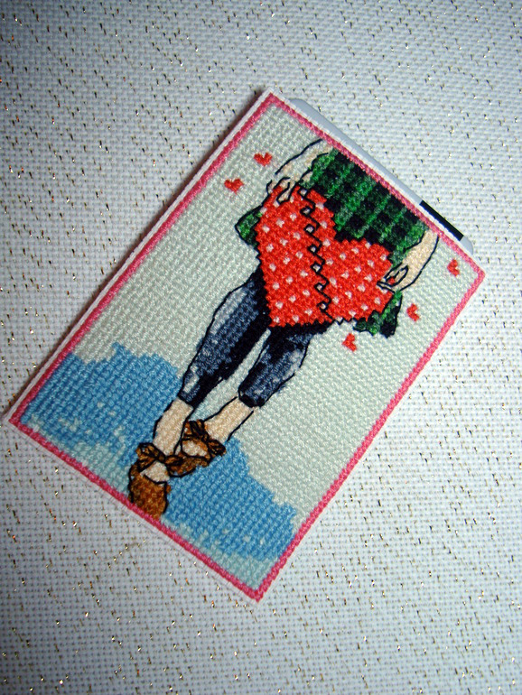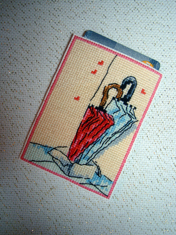 Чехол для пластиковой карты. Китайский набор, виниловая канва, полный зашив. В итоге два цвета на фоне (там где зонтики) слились в один, можно было зашить одним и сэкономить время. Вышивала долго, начала в прошлом ВД, а закончила только вчера.