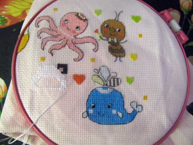 Приветики!) Я продолжаю тащиться еле перебирая ножками. Не получается поднажать, как ни стараюсь. Время на вышивку есть только, когда на ночь уложу ребенка, а пока укладываю так устаю, что сразу и сама засыпаю) Еще полярная ночь началась, вообще силы на нуле. Дошился китенок и ушко пандочки. Дошить 2-й ряд уже предел мечтаний. И, только на панде я обнаружила, что это я сама решила, что глазки у зверят вышиваются фр.узелками) По схеме там обычный крест)) Но мне нравится так как получается, из-за моих неровных фрузелков, глазки смотрятся более живыми, на мой взгляд)