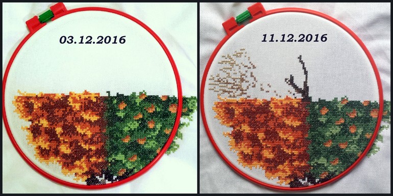 Всем привет)) я как обычно уснула пока сына спать укладывала...на этой неделе вышила немного, т.к вышиваю эти листики только днем в выходные, а это воскресенье я посвятила походу с ребенком в музей изобразительных искусств. Заодно зашла в пару магазинов и в рукоделов, где долго подбирала потерянную нитку... надеюсь разницу не видно. Ну и мое было/стало