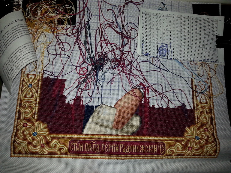 Сколько лет вышиваю, такого не чудила ни разу. Ну были ошибки, распарывала и перешивала. По мелочи. Но чтобы таааак!!! Думаю все разглядели, что складки на одежде не четко обозначены. А все дело в том, что я по ошибке 816 цвет намотала на бобинку 815 цвета. И разница почти не видна. Не передать словами, какое расстройство и разочарование я сегодня испытала. Столько отшить и заметить косяк, причем только тогда, когда на бобинке кончились нитки и намотала новую пасму. Еще ведь шила и удивлялась, чтож так схему то замудрили, ведь между 902 и 816 практически не заметно разницы. А оказывается, давно надо было цветную схему посмотреть, и заметить таки. В общем, днем я психанула, хотела даже снять со станка и забросить в дальний угол, но потом повязала, подостыла, распечатала заново нужные листы схемы и теперь, не торопясь, буду выпарывать все свои ошибки. Поддержите морально, пожалуйста)))).
