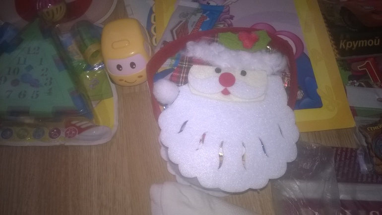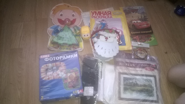 И она не была разочарованна получила набор для творчества. Мы обожаем раскрашивать фигурки из гипса. Рамочек еще не было. Сыну пришлась по душе книжка про машинки, а нашему папе достались конфеты в красивой корзинке и носки, он был очень тронут, обычно только нам с детьми достаются подарки. Мне конечно же вышивальные вкусняшки. Еще было много чего, смотрите сами. Лариса, спасибо от всех одаренных, очень приятно получать подарки собранные от души.