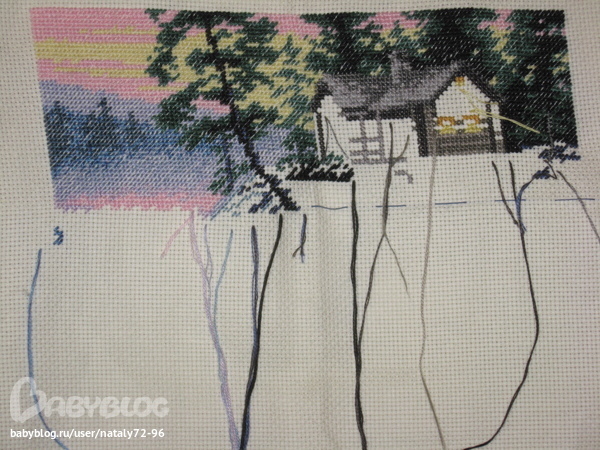 остался белый кусочек-овальчик рядом с домом и закрыть белые дырки в заборе, что кто-то до меня не вышил в своём кусочке. Думала сегодня закончу, но у нас дома печальная новость - умерла бабушка мужа... все уехали на похороны, так что я пока с малявками одна осталась дома