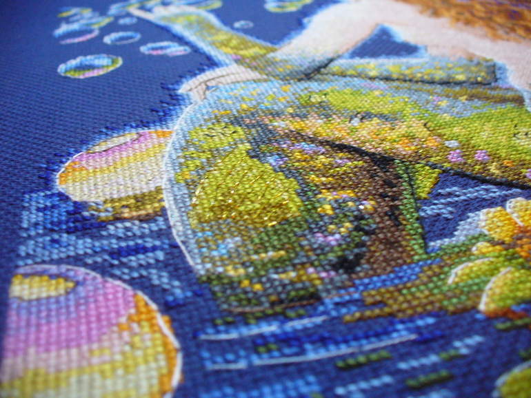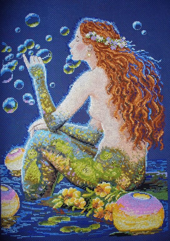 Всем привет! Хочу показать свою работу от Мережки.Первая моя работа от этой фирмы и точно могу сказать не последняя!))) Все очень понравилось, начиная со схемы и комплектации и заканчивая результатом. Русалка вышита на 16 канве синего цвета нитками ДМС(39 цветов + 2 металлика), размер 23 х 31 см, работа выполнена крестом и полукрестом