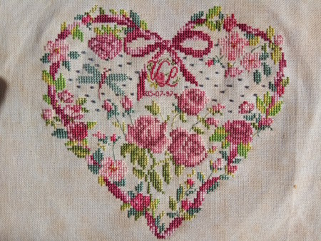 Всем привет) дела закрутили с головой меня, а еще тепло стало, солнышко, гуляния по 4-5 часов в день, все бегом..)) вот и сейчас, ребенок держится за подол, гулять тащит, а мама строчит в темпе отчет)) по вышивке: намудрила я, девочки..а все потому что мне приспичило вместо искусственных бутонов роз, как в схеме, вышить просто розочки, ну и наши с мужем монограмму и дату свадьбы. Ничего толком не помещалось, стопитсот раз распарывала, измотала эту ткань уже, и немного скомкано получилось( но сердце закончила) ура! потому что приелись розочки..