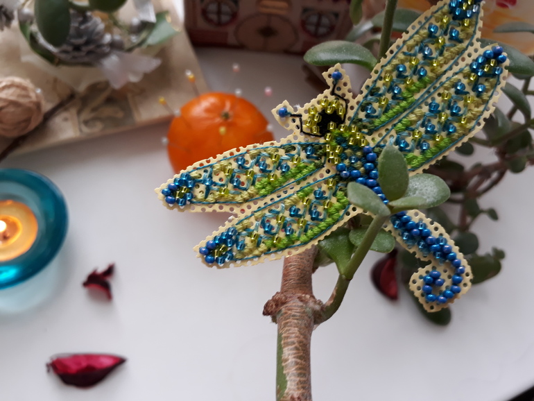 Знаю, что переделывать скорее всего уже не будешь )))))) уже устала )))) ( я просто сама , относительно недавно, метрики вышивала и боролась с буквами и цифрами , порола караул ) . Но я бы циферки перенесла вправо , как бы напротив стрекозы и убрала бы бисер вообще , мешает восприятию и так всего много . Но ! это только мое мнение , это сделала бы я )