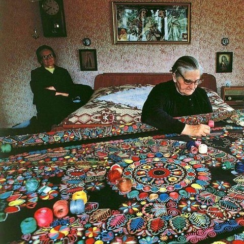 Я видела это фото. Масштаб вышивки и количество цветов впечатлили. Удивили радиоприемник на заднем плане и иконы на стене. Какого года эта фотография?