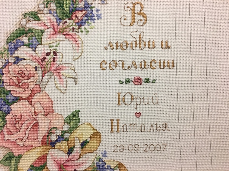 Схемой надписи со мной поделилась одна добрая вышивальщица с другого сайта. Только имена и дата свадьбы поменяла на наши.
