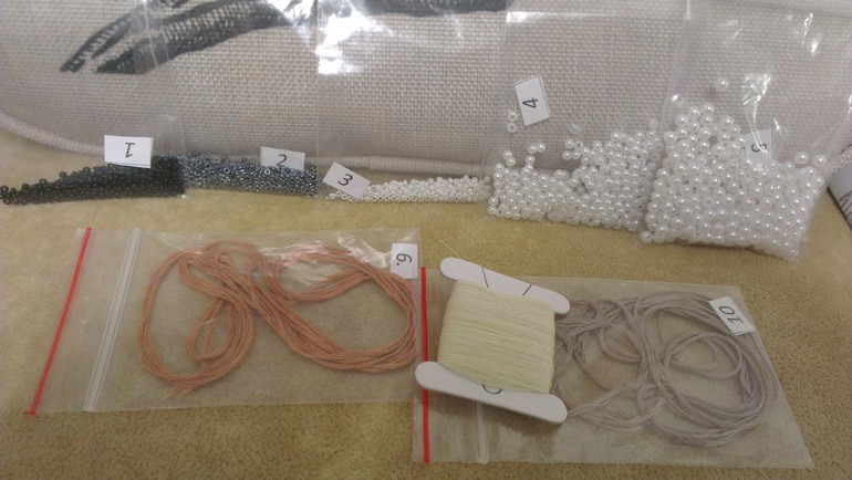 К большому моему разочарованию в инструкции не было указанно во сколько ниточек вышивать перья. Поэтому тут были эксперементы - я пробовала и в 2, и в 3 нити шить. В итого вышила все в 6 нитей.