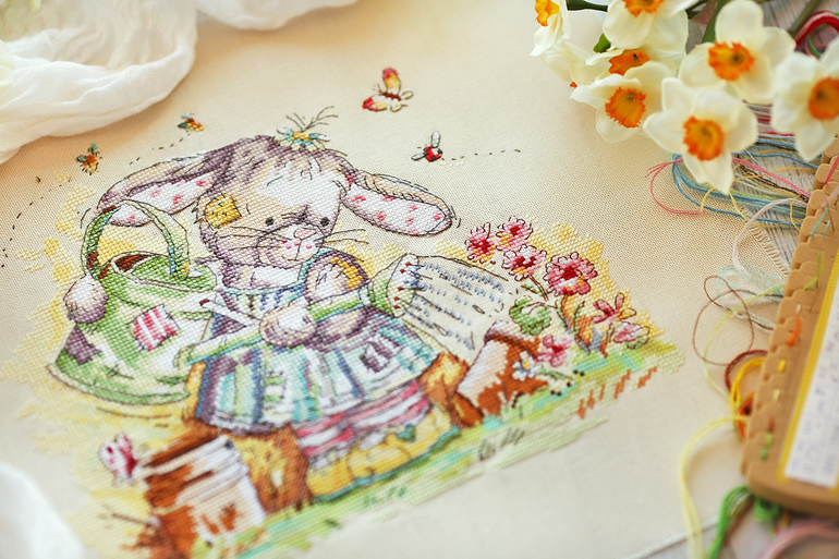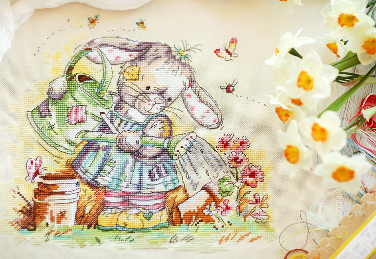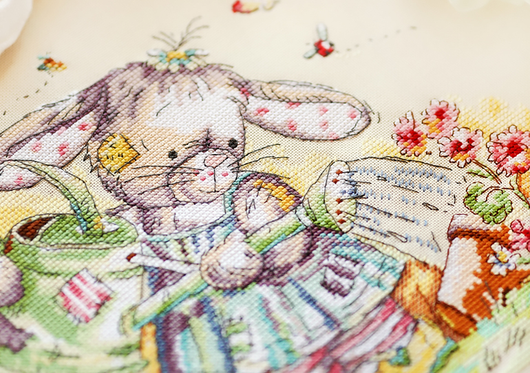 Очень люблю этих зайчиков и, честно говоря, глазами вышила бы почти всех из серии. Но останавливает бэк. И даже, несмотря на то, что к нему я отношусь спокойно и даже люблю, но здесь он очень утомляет. Он не счетный и местами уже просто шила на глаз, потому что следить за каждой клеточкой по схеме очень муторно. Но именно в этих зайцах вся фишка в этом беспорядочном бэке. Картинки становятся более графичными, более мультяшными, что ли.