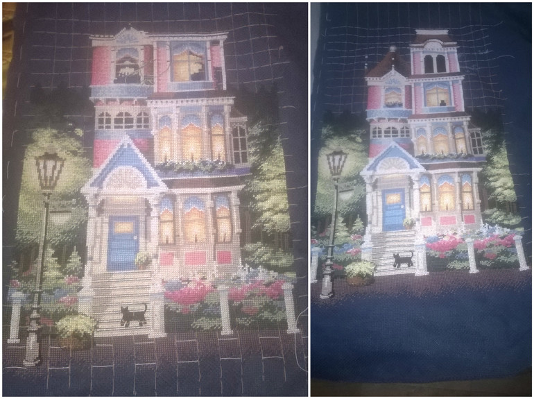появилась часть головы собаки. В приметы верю. Верю в материализацию мыслей и желаний. Так что нужно почаще думать о хорошем. Приметы в вышивке срабатывали. Лет 10 назад вышила пейзаж с домиками,ещё не зная о примете. В результате получила в наследство квартиру, совершенно неожиданно!