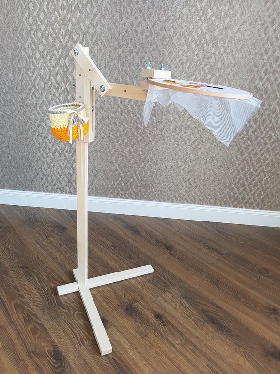 Станки,пяльцы,органайзеры и другие принадлежности для вышивкиХочу поделиться своей удачной покупкой. Я пытаюсь освоить люневильскую вышивку, и сначала меня вполне устраивали пяльцы прижатые к столу увесистой книгой. Я все собиралась купить струбцину, но потом решила купить держатель для пялец. Выбор пал на напольный держатель от Сереги-мастера. Цена приятная, 1100 руб. всего, и мне нравится материал - дерево. Что то пластик не вяжется у меня с вышивкой, хочется натуральных материалов. Вот такой приехал ко мне держатель. Мастер говорит, что он может держать и раму 40 на 30 см., но я не пробовала. Мои пяльцы он держит прекрасно, легкий, мобильный, вполне устойчивый, места много не занимает, регулируется по высоте, есть доступ к изнанке. Я еще к нему прикрепила корзиночку для мелочей, и хочу лампу купить на прищепке. В общем для меня одни плюсы, минусов не нашла, хотя сравнивать мне не с чем. Вот, решила с вами поделиться, вдруг кто, то же ищет что то подобное.