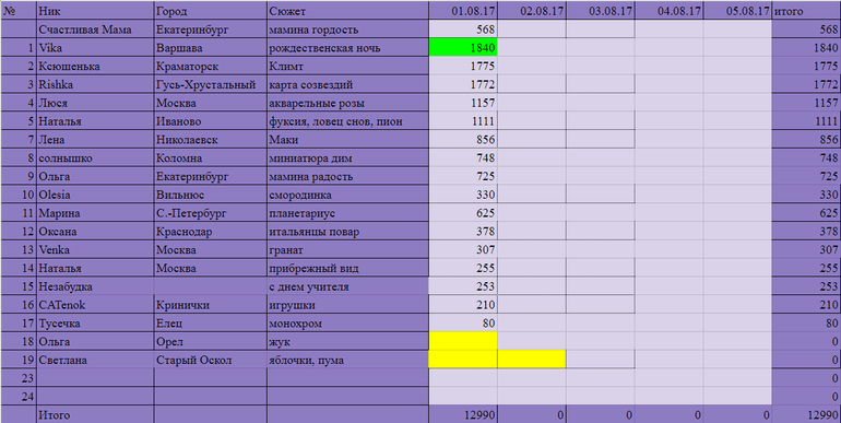Игра "Вышивальный забег"Всем привет! Я проводила мужа на работу и села подводить итоги первого дня забега. ну что могу сказать...Все большие молодцы! Несмотря на рабочий день, цифры у многих астрономические))) на старте сошло у нас 4 человека, ну а мы не сдаемся и продолжаем вышивать))) Лидером дня стала Vika с результатом 1840 крестиков, совсем немного отстала от нее Ксюшенька 1775 крестиков и буквально 3 крестика не хватило Rishke чтобы догнать Ксюшу-1772 крестика! Радует что в лидерах новички забега. Молодцы!!! А за день у нас 12990 крестиков))