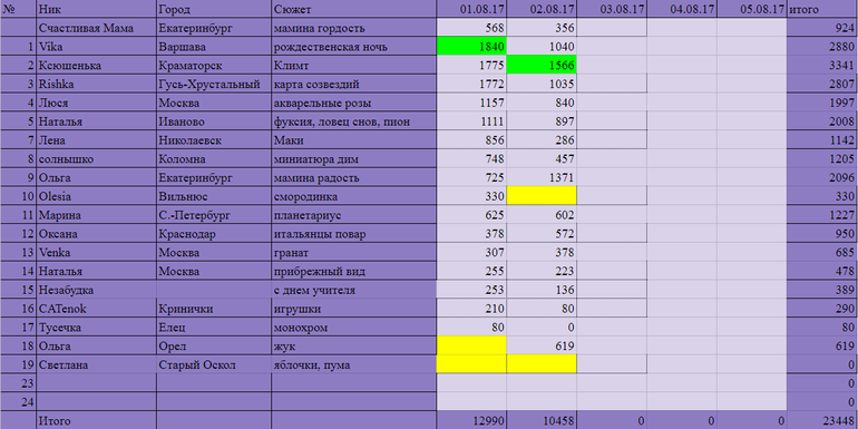 Игра "Вышивальный забег"Всем привет! Хорошо бежим))) где-то отстала Тусечка, но думаю что она догонит...Ну а мы бежим дальше и отстающих не ждем))) Лидером дня сегодня стала Ксюшенька-1566 крестиков, за ней бежит ольга с работой мамина радость - 1371 крестик, ну а замыкает тройку лидеров вчерашний лидер-Вика с результатом 1040 крестиков))) Молодцы!!! Ну а в общем у нас 10458 крестиков