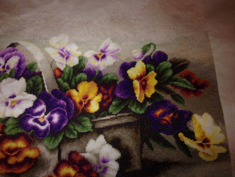 Только крест в две нити и всё! Ни бэка, ни полукреста, ни одиночек. Но маялась я долго - куча однотипных цветов рядом, обилие серых, грязно-белых оттенков меня сводили с ума. Где-то на половине работы я всё же решила размечать отшитые участки схемы маркером - и тут работа понеслась, стало гораздо проще