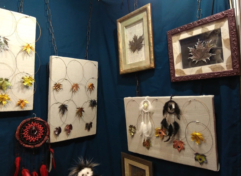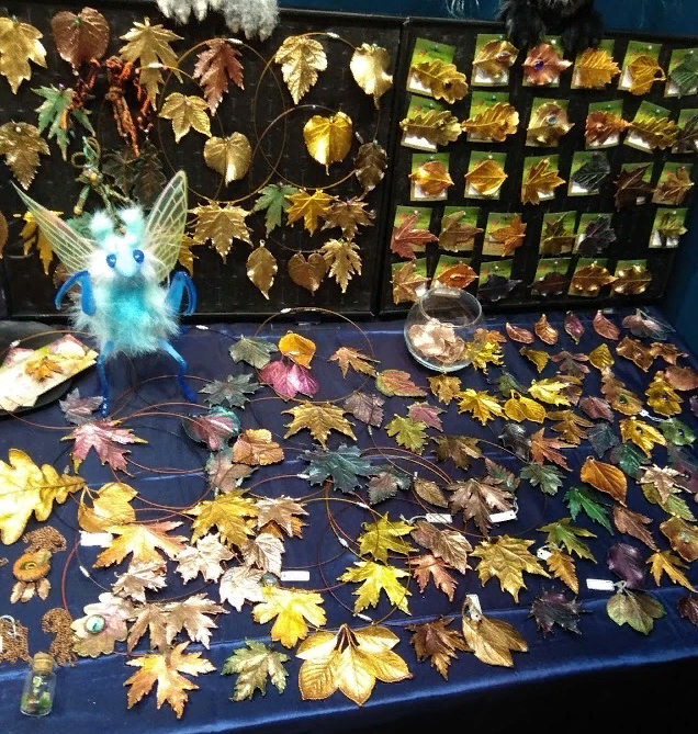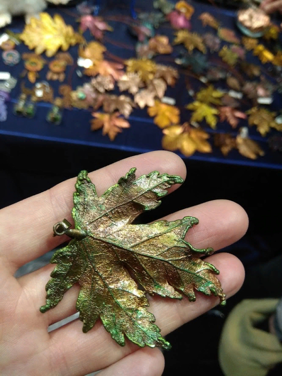 Техника называется, кажется, гальванопластика. Как объяснил мастер, это живые листочки, покрытые слоем металла гальваническим методом.Что-то в этом роде...Я и физика,мы не дружим))))