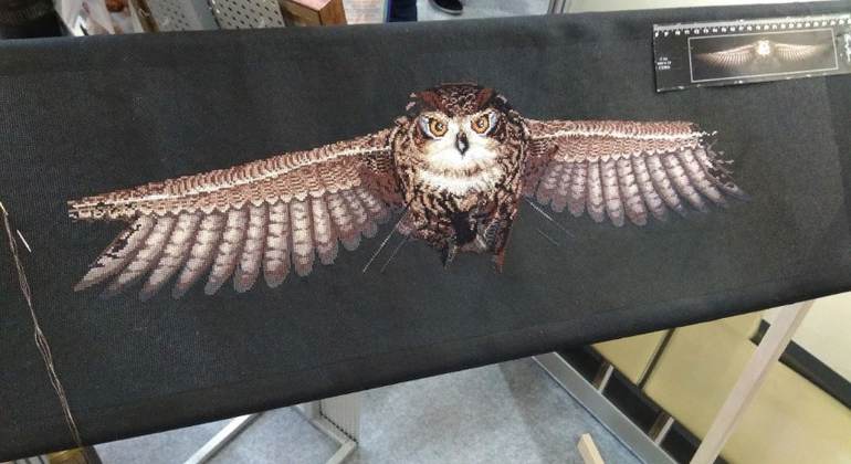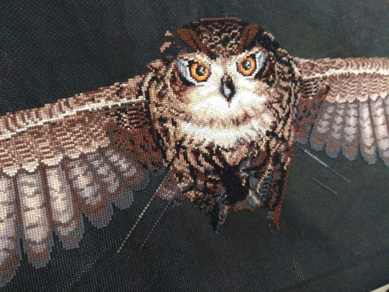 А я залипла у совы))) Она была показана в недошитом виде, на станке, и это ничуть её не портило! Она шикаррррна!!!! Размах крыльев этой птички- 1метр!