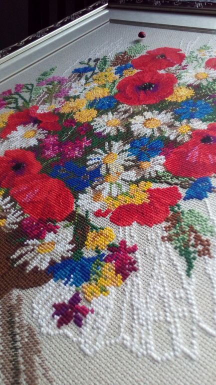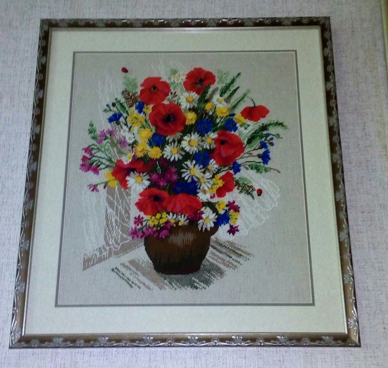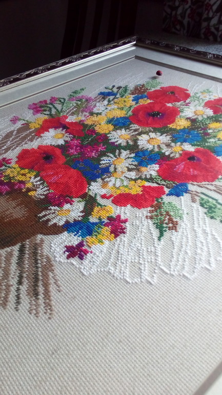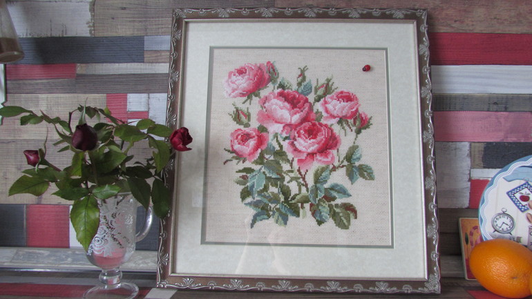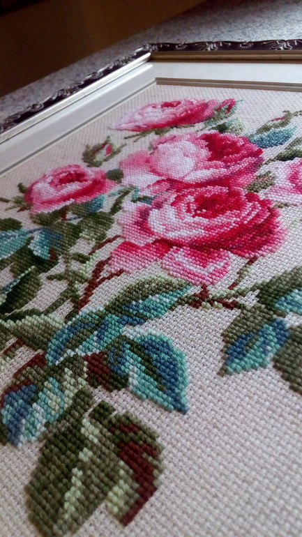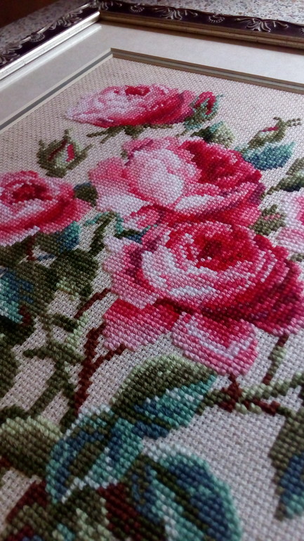 Риолисовские розы вышивала не на белой канве, а под лен, чтобы с другими букетами сочетались))) и на 14, а не на 10 как в наборе, в 2 нити