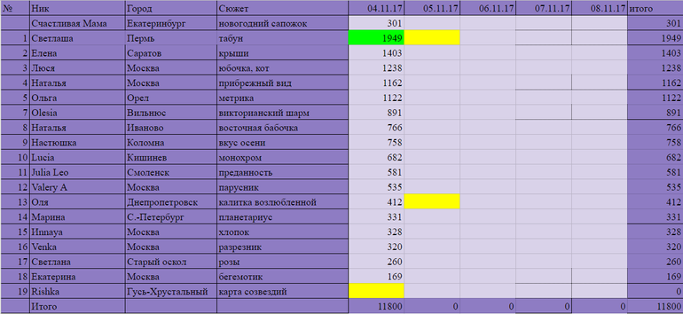 Игра "Вышивальный забег"Всем привет! Мы очень удачно стартанули-за день вышили 11800 крестиков. Лидером дня стала Светлаша - 1949 крестиков, за ней бежит Елена - 1403 крестика и замыкает тройку лидеров Люся - 1238 крестиков. Молодцы!