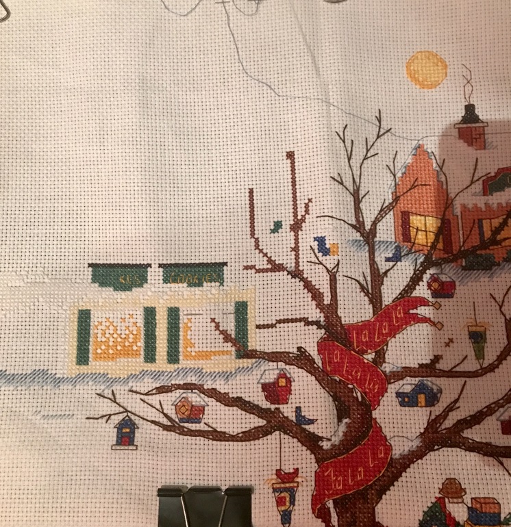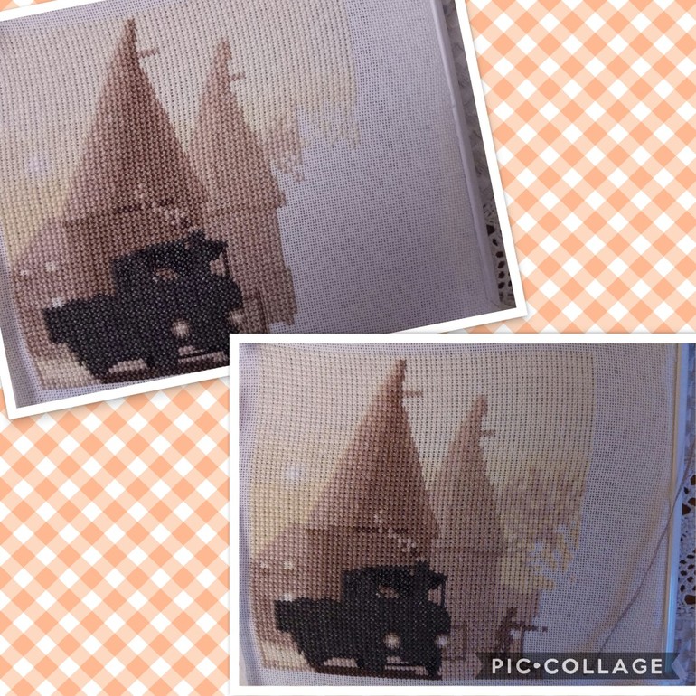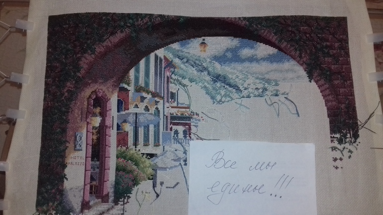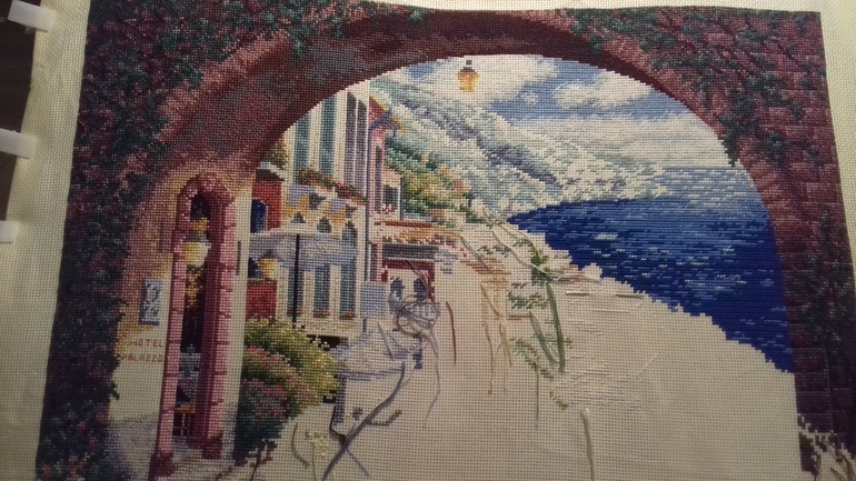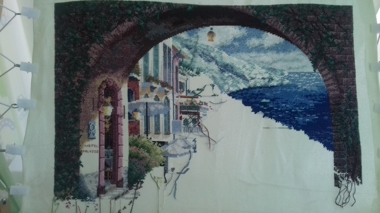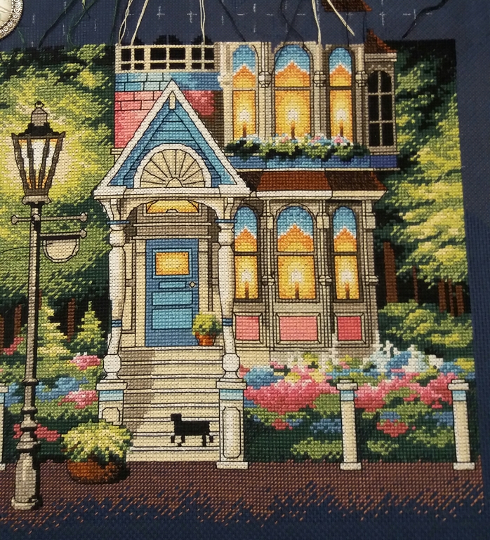 Ага, море быстрее вышивалось, цветов и одиночек не так много. Теперь пошел город: домишки, кустики, окошки....