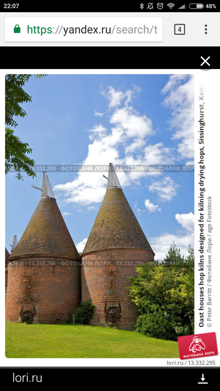 Эти сооружения круглой формы с конусной крышей, если не ошибаюсь, строили в Англии в 30 годы для сушки хмеля, который использовали для варки пива.