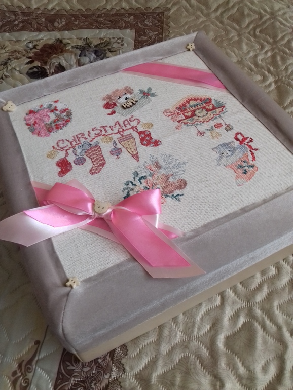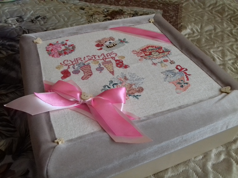 Вышивка крестомВот такой короб сотворился еще в канун нового года) послужил упаковкой для подарка дочери, а теперь она хранит в нем часть своих скрап-запасов (бумагу, и всякие разности) упакован основательно, под самую крышку)))