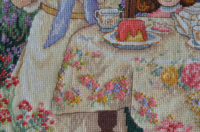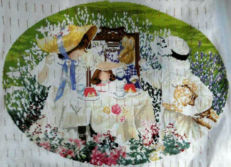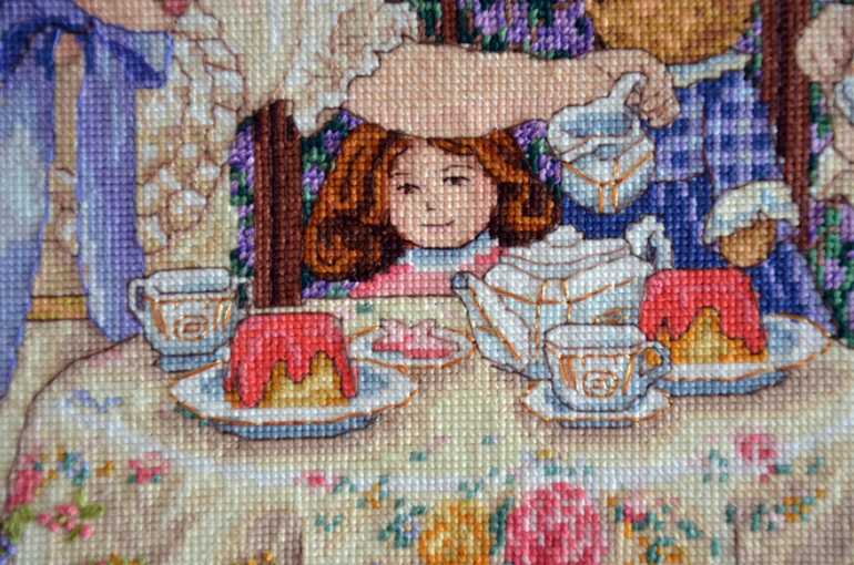 Вышивалась работа подбором, но лица девочек и куклы, мишка, зайчик, волосы и бежевый тон скатерти нитками Дименшинс.