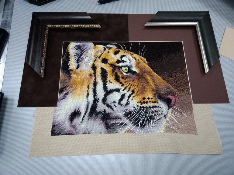 Ух ты.....тигр какой красивущий, величественный такой и одежка ему очень идет, в реальности бархатное паспарту еще лучше смотрится наверняка, фото все-равно не передает всей красоты и котенок - симпатяга!