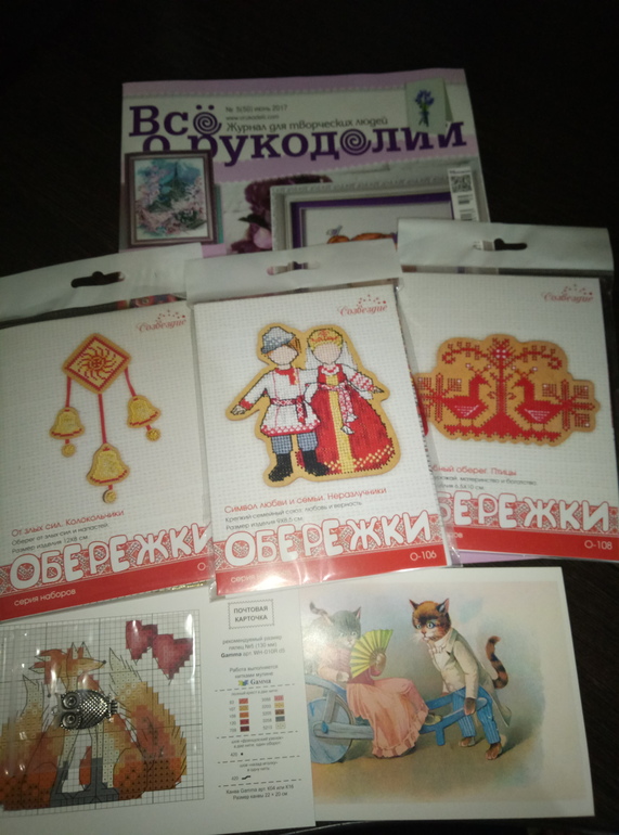 Радость ХомякаДевочки а я сегодня забрала посылочку с заказом. А заказала я 3 обережка от фирмы "созвездие". Для меня вышивание такого плана наборов впервые и я очень надеюсь что справлюсь с ними и разберусь что к чему и как их правильно собрать. Ну и в подарок мне прислали схемку, шармик с совой и журнал-мелочь а приятно