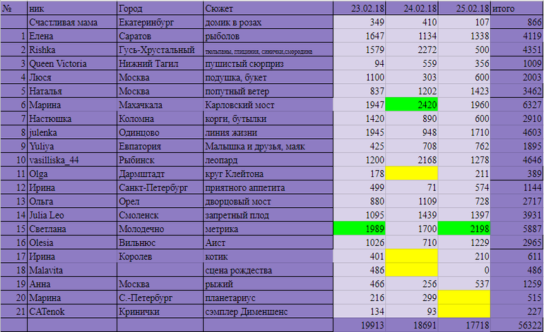 Лидером дня сегодня стала Светлана с результатом 2198 крестиков, зав ней к финишу прибежала Марина из Махачкалы с результатом 1960 крестиков и замыкает сегодняшнюю тройку лидеров julenka с результатом 1710 крестиков