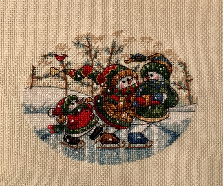 Я закончила снеговиков. Очень устала от 18 канвы. Особенно бэка много. Провозилась с ним очень долго. Теперь буду подушку вышивать и собачку. И всех нагоню. У меня с % 1486 крестиков. Праздник так себе, сидим с температурой и у меня горло сильно болит, даже голову не повернешь(